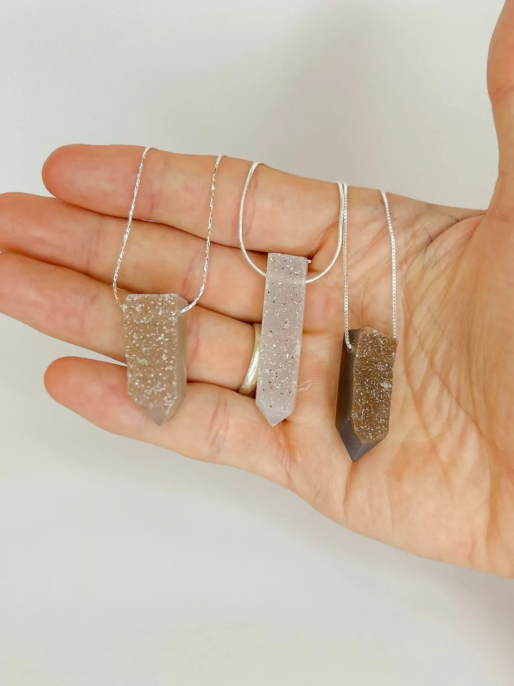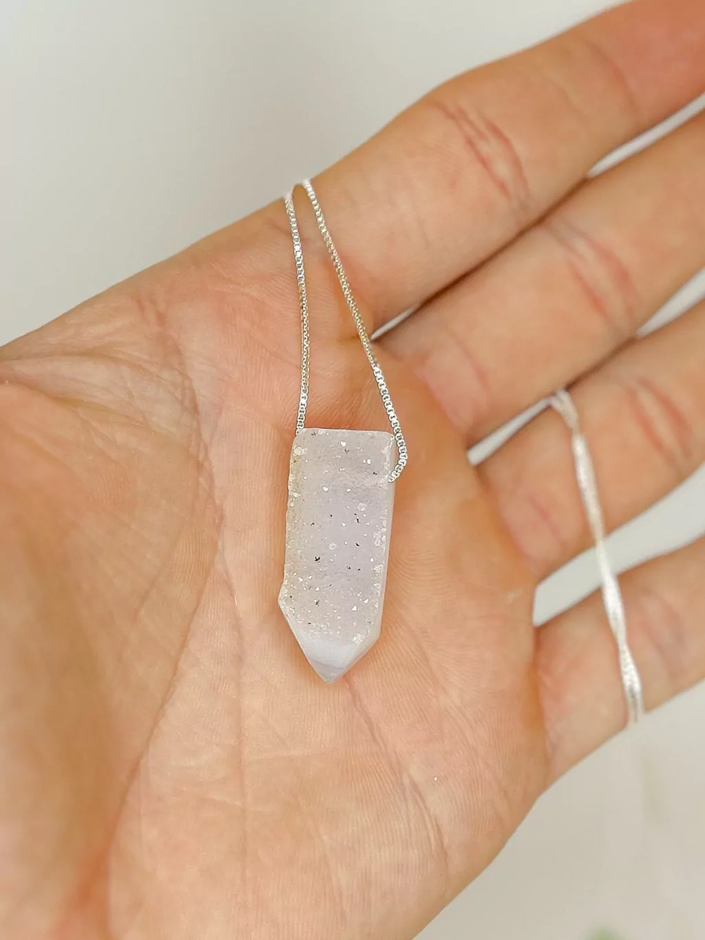Apresentamos o colar Solluna, uma peça deslumbrante que combina beleza e energia em um só acessório. Com um banho prata e uma delicada ponta drusa de ágata, este colar é um verdadeiro amuleto de proteção e vitalidade.