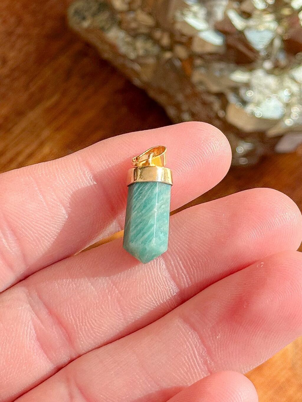 1 pingente de Amazonita em mini frasco de vidro – um amuleto delicado que preserva a energia da pedra de forma simbólica e protetora;