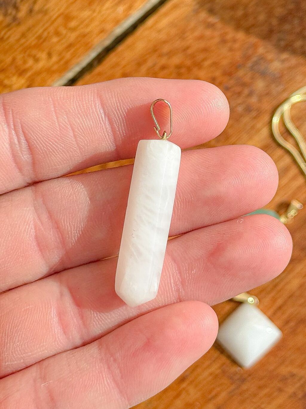 Descubra um conjunto especial que une três pingentes: dois de quartzo branco e um de quartzo verde e uma corrente banho dourado de 45cm.